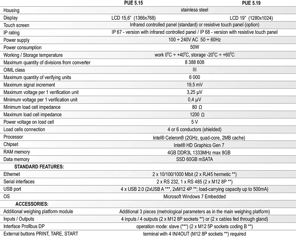 PEU 5 tartım terminalleri, maksimum 6000 e taksimata sahip terazileri oluşturmak için tasarlanmıştır. PUE 5 serisi, temel modele benzer şekilde, en yüksek IP derecesi olan IP 67 'ye sahip paslanmaz çelik bir kutu içine yerleştirilmiştir. Terminallerin standart olarak sundukları arayüzler: 2 × RS232, 1 × RS485, 1 x Ethernet, 4 x USB 2.0. PUE 5 serisine, maksimum 4 tartım platformunu eşzamanlı çalıştıracak şekilde 3 tartım modülü daha takılabilir. Opsiyonel olarak sunulan PROFIBUS DP arayüzü, terminallerin endüstriyel ProfiBus ağına bağlanmasını sağlar Fonksiyonel Özellikler | ||||||||||||||||||||